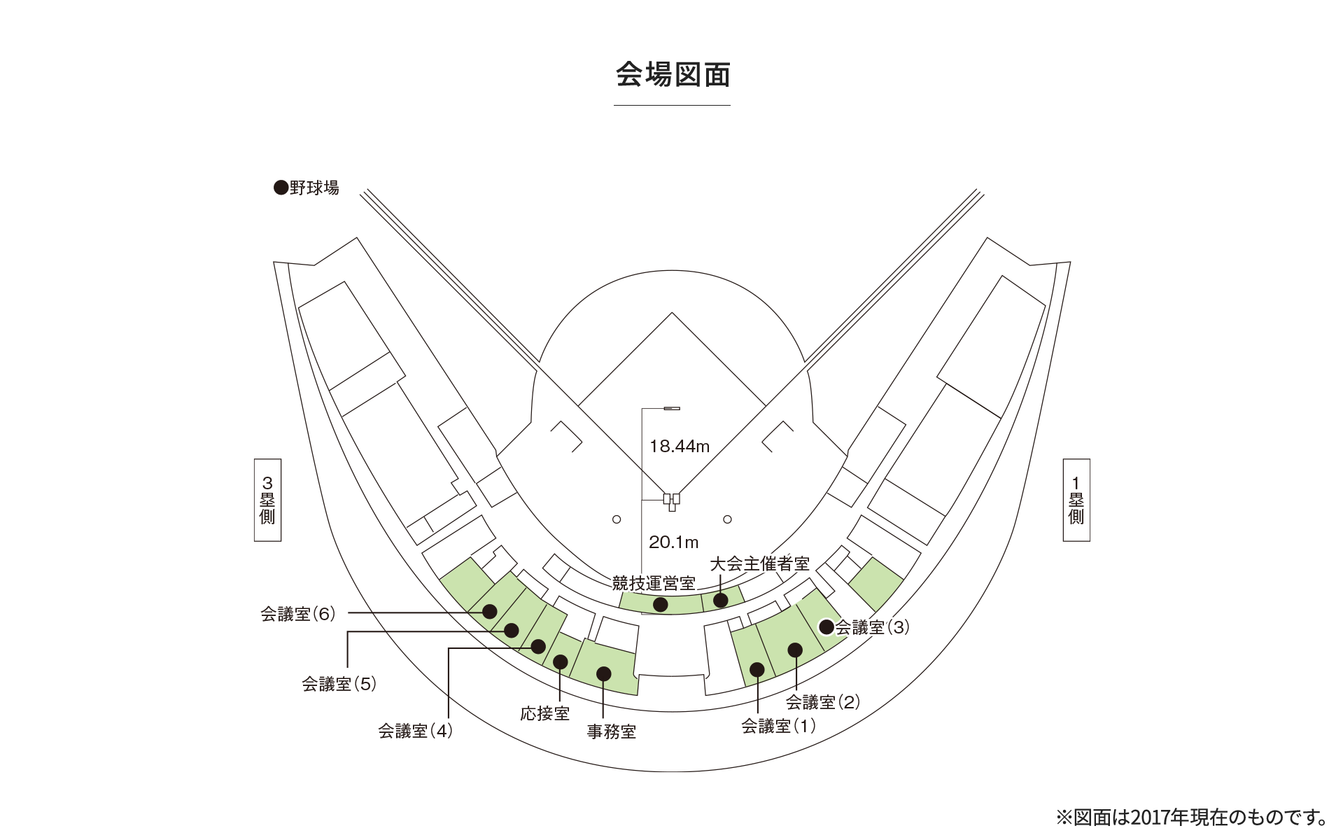 | 野球場 | 8,485 | 平日(税込)/1h(入場料を徴収しない場合)児童・生徒の団体 1,542円 ・一般団体 4,628円 ・プロスポーツ団体 21,600円 ・その他 13,886円 | 収容人数:約20,000(内野スタンド席15,000席) 付帯設備:医務室・会議室・貴賓室・競技運営室・大会主催者室・記録室・審判員室・整備員控室 ウォーミングアップ室 野球資料館 他 条件等:飲食物持ち込み可(ビン禁止)ペット禁止(介助犬は可) | |||||