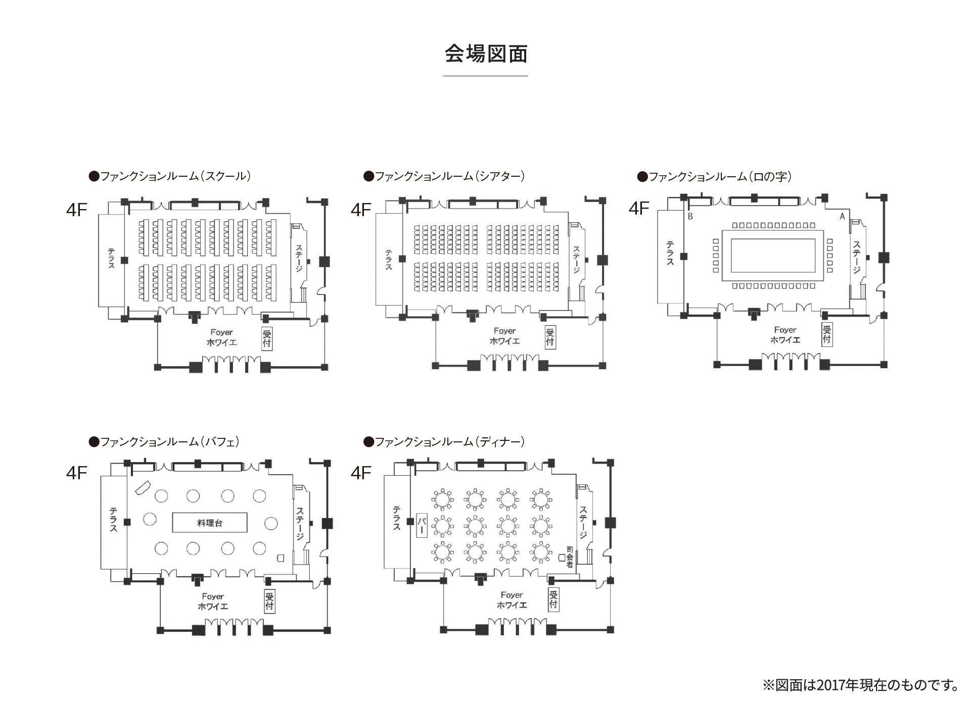 | ファンクションルーム(A)+(B) | 204 | 120 | 120 | 150 | 180 | 4.0~6.0 | 基本料金/2h 140,400円 1時間毎延長 70,200円 1日室料金 9:00~18:00 631,800円 |