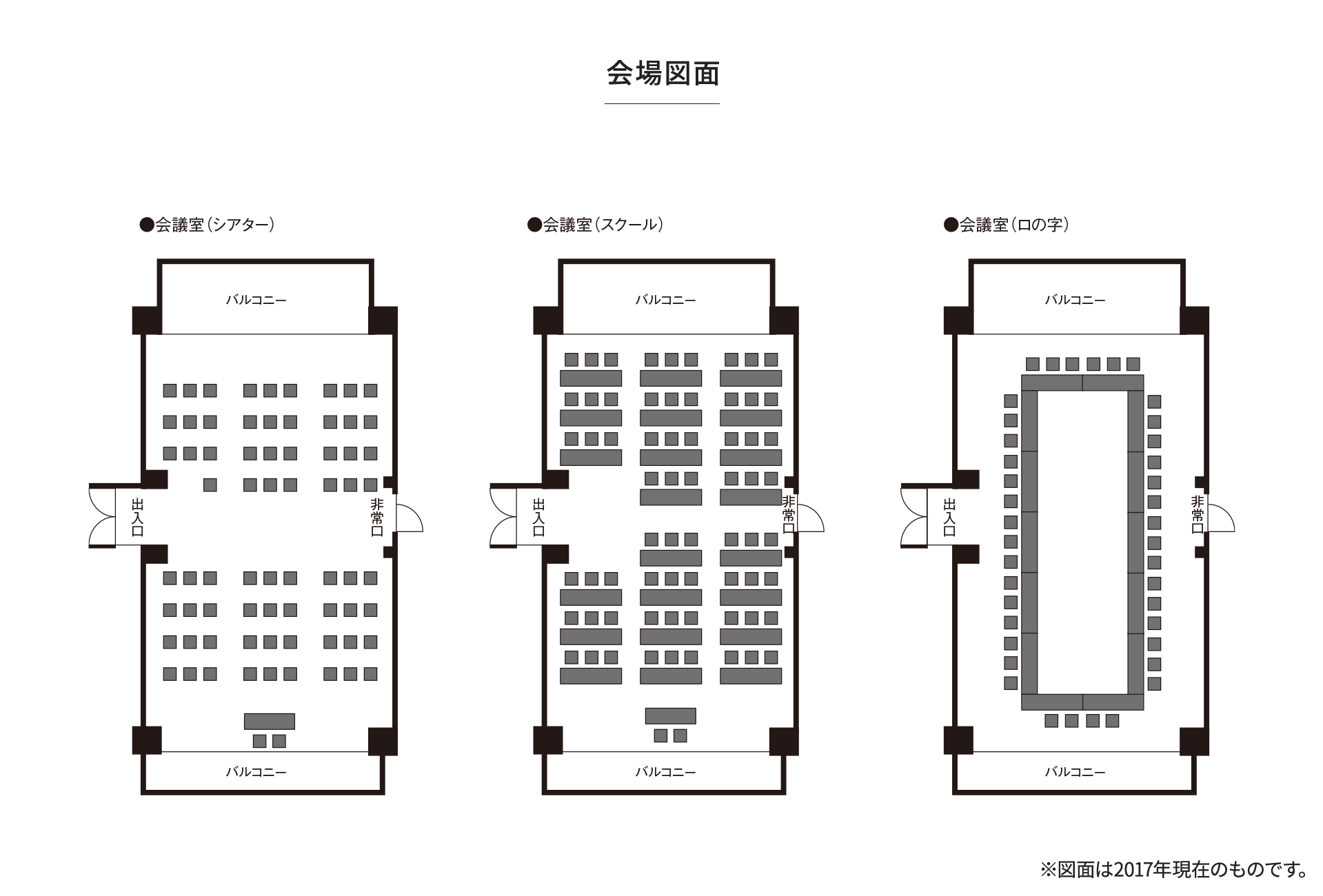 | 会議室 | 70 | 60 | 不可 | 不可 | 96 | 約2.4 | 利用料金(税込) 1h 9:00~12:00 7,500円 利用料金(税込) 1h 13:00~17:00 8,500円 利用料金(税込) 1h 9:00~17:00 15,000円 |