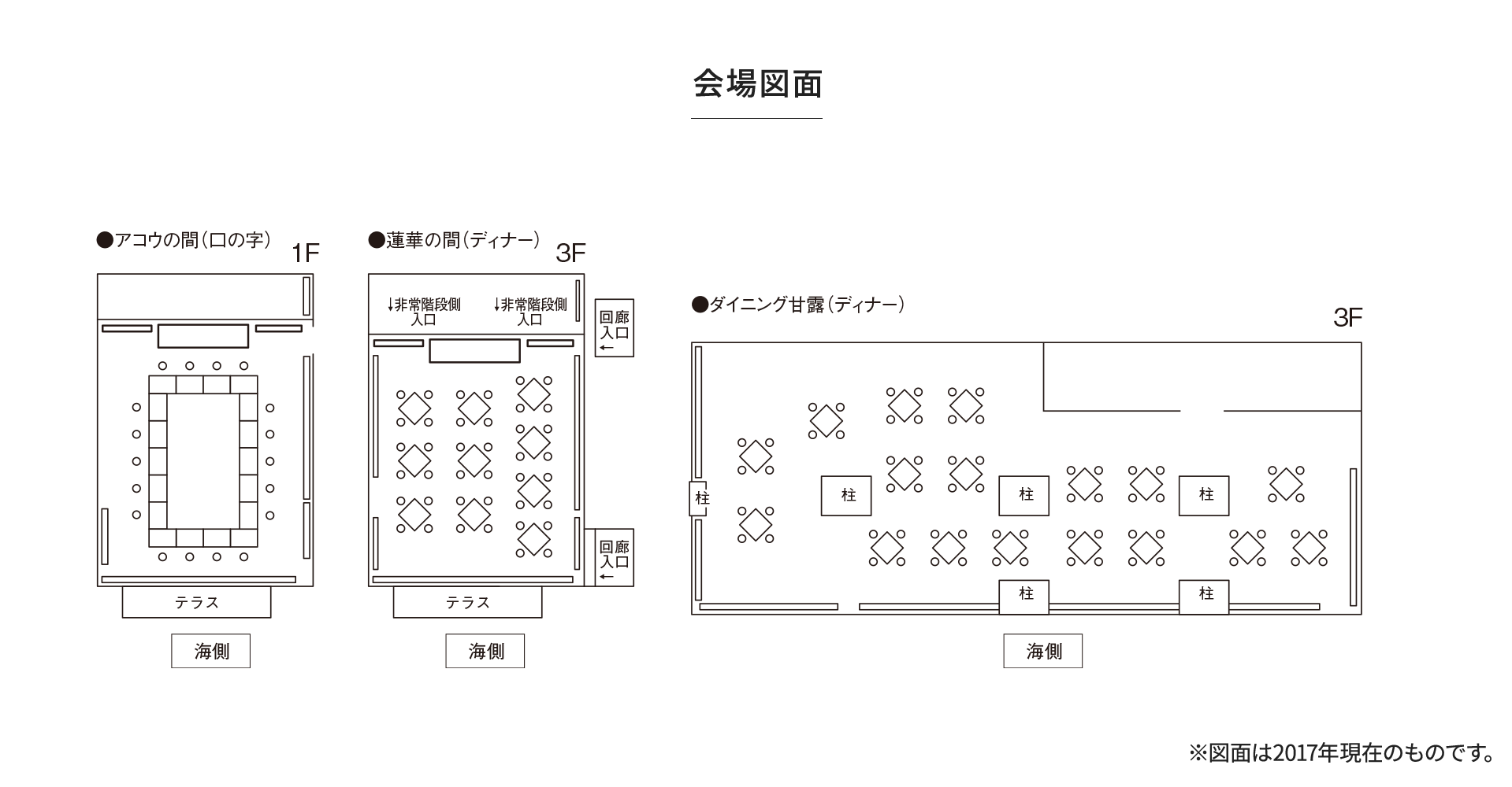| 甘露 | 不可 | 不可 | 60 | 需要咨询 | 192 | 2.7 | 使用价格(含税) 会议室/1h 100000日元~ | 附带设施:音响器材・投影仪 |